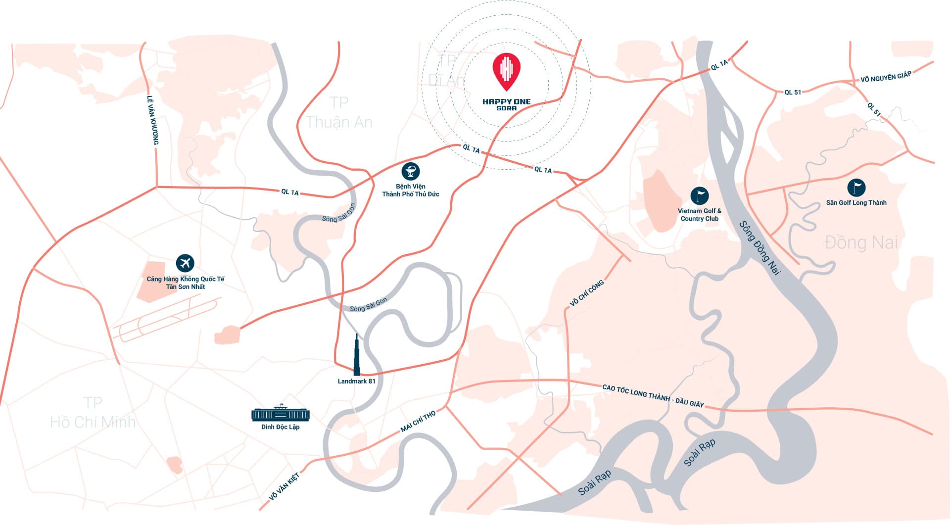 Happy One Sora có vị trí đắc địa tại Linh Xuân Thủ Đức, giúp cư dân dễ dàng di chuyển đến các vị trí trung tâm.